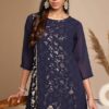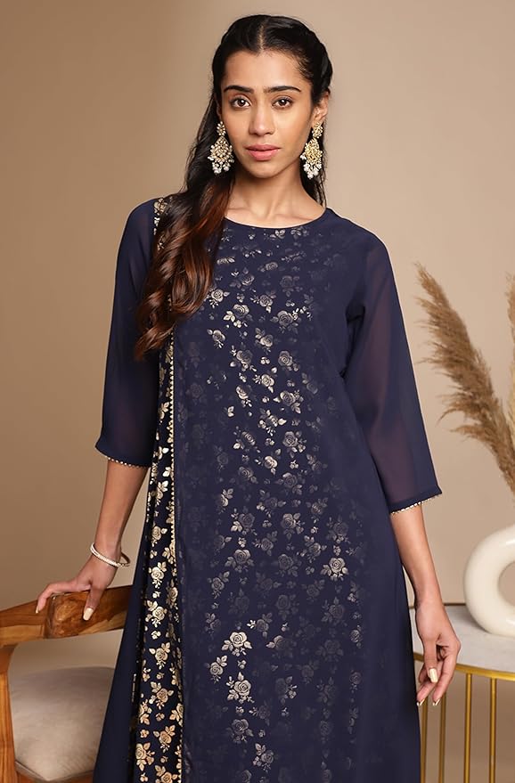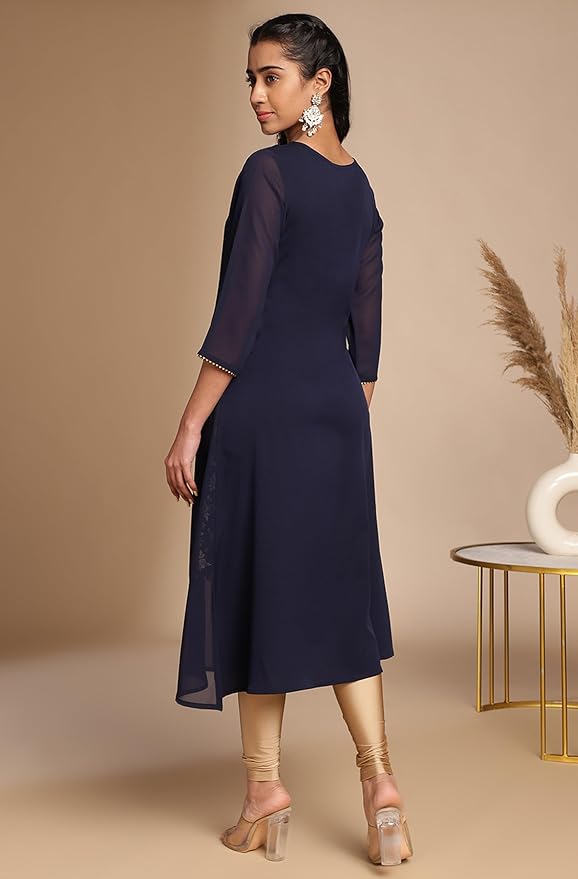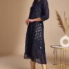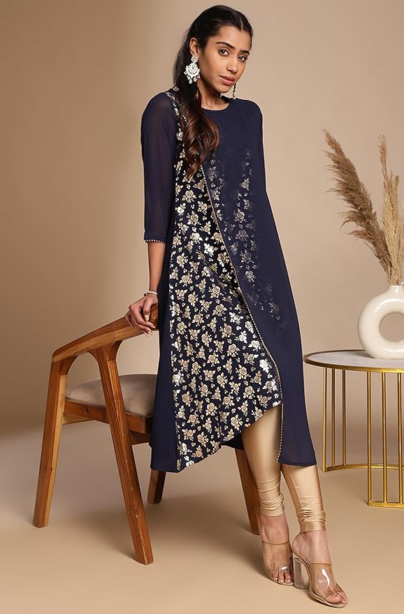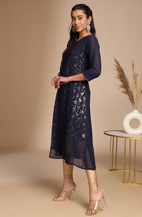 • Kurta Length: 44(IN) | Colour: Navy Blue | Pattern: Foil | Occasion: Festive | Style: A-Line | Sleeve Type: Three-Quarter Sleeves (Regular Sleeves )