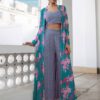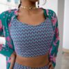 - [Unique Design] Regular Style with jacket and straps crop top, Unique Chevron style, Turquoise Trending hue, Festive-Wedding Style, woven georgette fabric, layered, Intricate details with sequin embroidery and floral pattern, crop top with Pant and Jacket set. Make it an Ideal Clothing Choice for any wedding occasion.