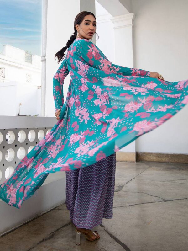 - [ Features ] Spring Summer Set for Women, regular long sleeves, Chevron Georgette Pants, Crop Top, and Palazzo Set, Turquoise Color, Floral and Chevron Pattern, 3-piece Style.